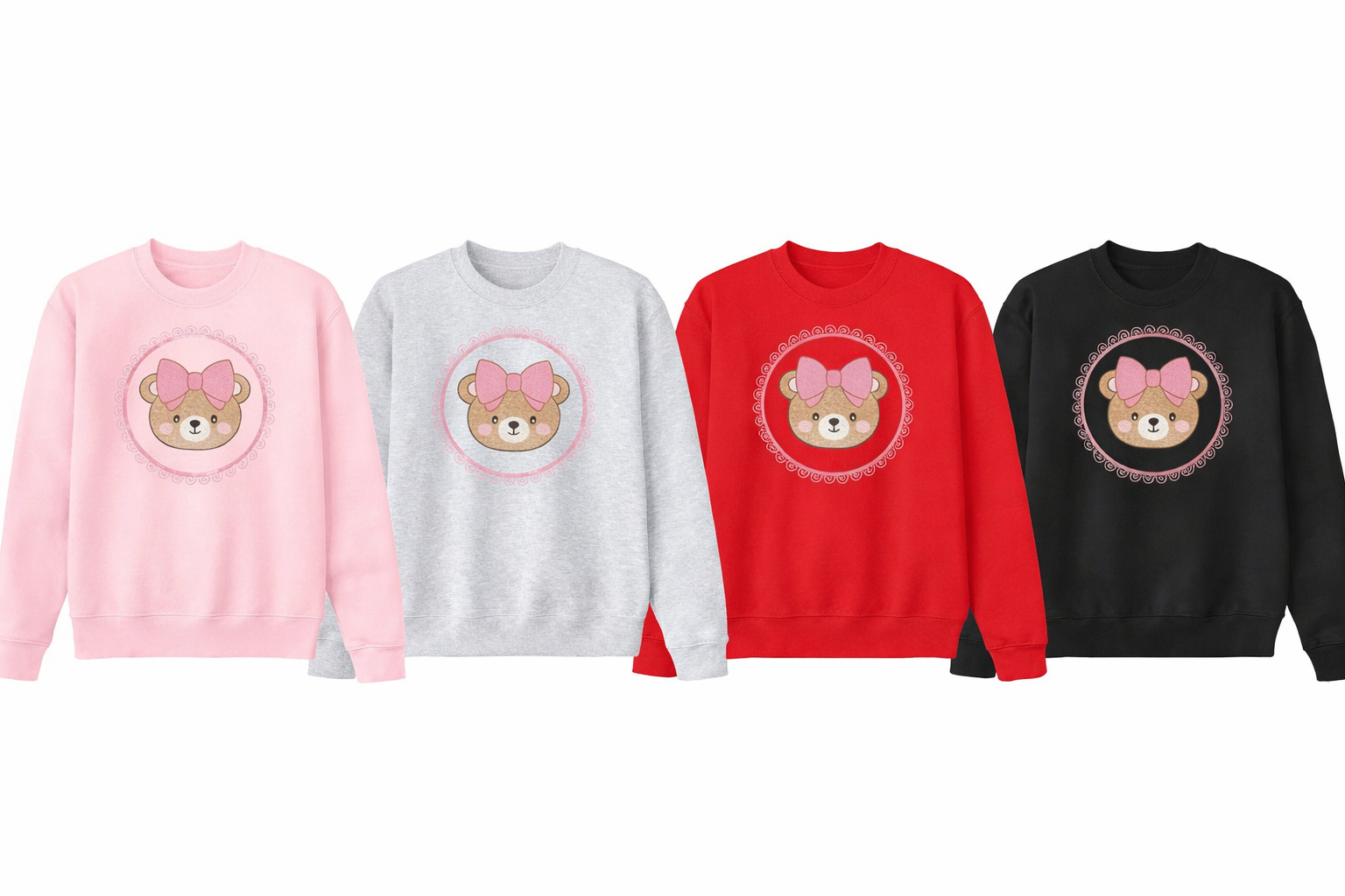 Our Beary Sweet Bow Crewneck features an adorable teddy bear framed in a delicate lace-inspired circle and finished with a soft pink bow, a design made to spread warmth, comfort, and love.