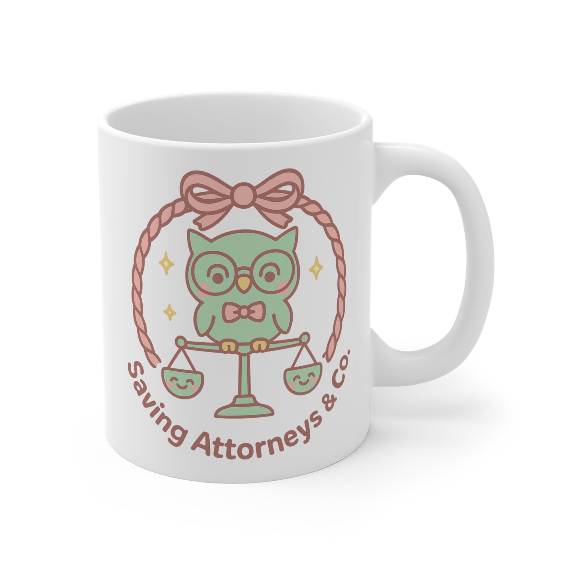 Our Saving Attorneys & Co. 11 oz Mug is the perfect desk companion for long days filled with filings, case prep, and caffeine. Featuring an adorable owl holding the scales of justice, this pastel design combines professionalism with personality because saving attorneys one case at a time deserves a stylish sip.